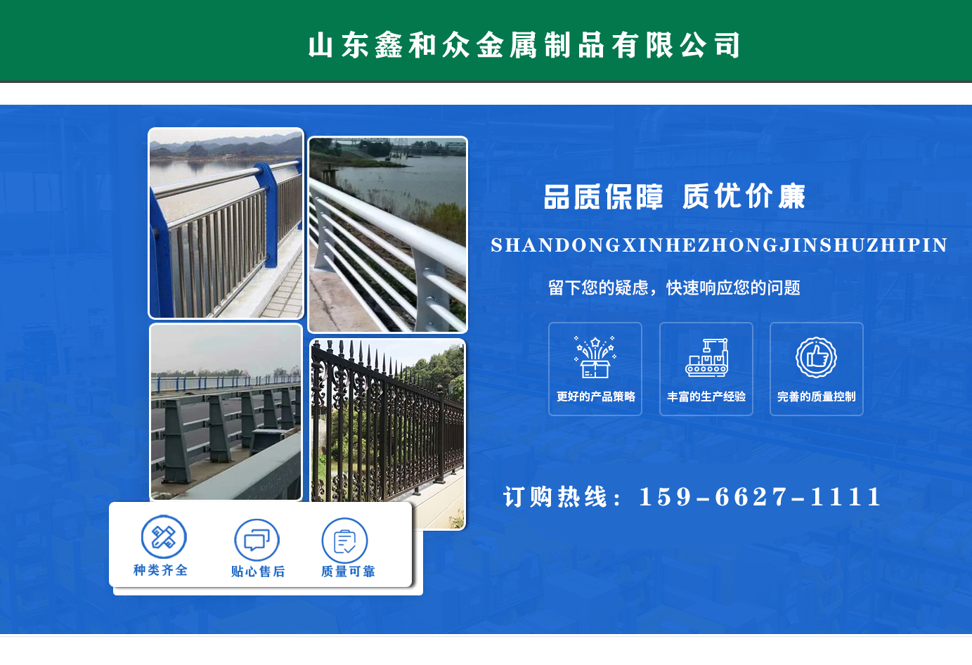 山東鑫和眾金屬制品有限公司主要產(chǎn)品有防撞護(hù)欄,橋梁護(hù)欄,道路護(hù)欄,河道護(hù)欄,不銹鋼護(hù)欄等護(hù)欄。提供設(shè)計(jì)方案,一站式定制,包您滿意價(jià)格優(yōu)惠,歡迎來電咨詢! 公司常年從事銷售護(hù)欄防撞護(hù)欄,橋梁護(hù)欄,道路護(hù)欄,河道護(hù)欄,不銹鋼護(hù)欄,橋梁鋼護(hù)欄,河道燈光護(hù)欄等。產(chǎn)品廣泛應(yīng)用于橋梁、河道、旅游景區(qū)、道路、公路、公園、小區(qū)、景觀、道路防撞等領(lǐng)域?! 」井a(chǎn)品均采用優(yōu)質(zhì)不銹鋼材料,符合相關(guān)標(biāo)準(zhǔn)。各種型號(hào)不銹鋼復(fù)合管及護(hù)欄,質(zhì)量嚴(yán)格把控。產(chǎn)品強(qiáng)度高、耐腐蝕、焊接牢固、抗沖擊、性能好,防撞護(hù)欄結(jié)構(gòu)簡(jiǎn)單、美觀實(shí)用大方。 歡迎前來訂購(gòu)!...